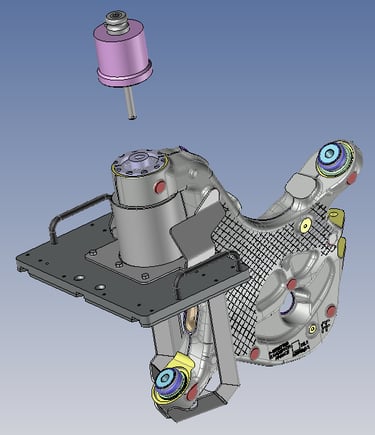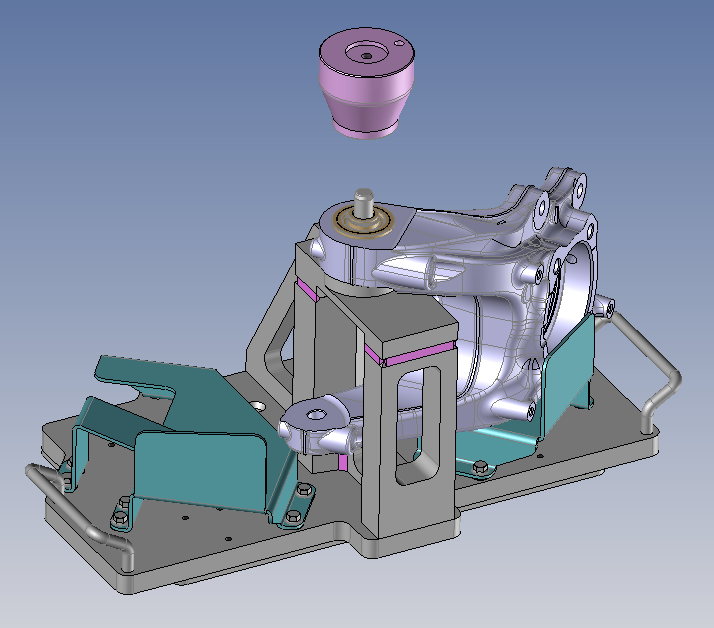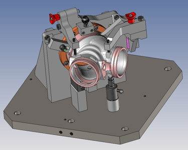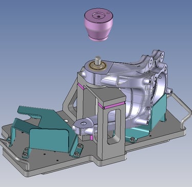 Dans le cadre de différentes productions dans le domaine de l'automobile, étude de conception de plusieurs montages d'assemblage et d'usinage pour des pièces de forme complexes issues de fonderie aluminium.