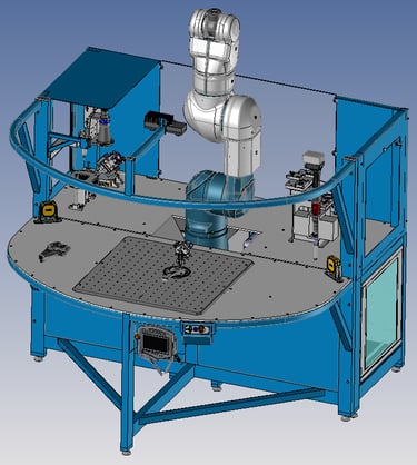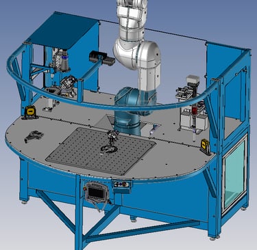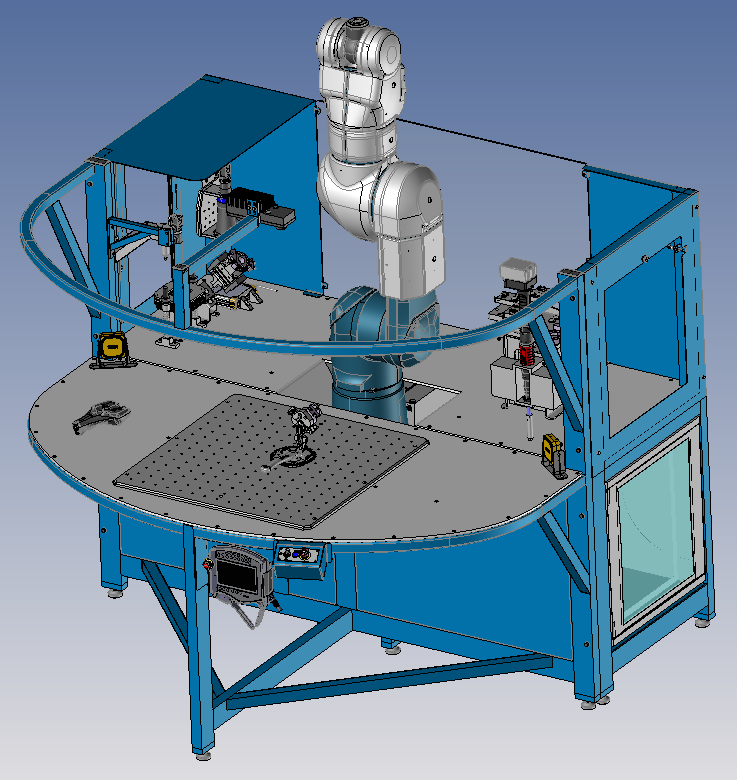 Afin de promouvoir les technologies de robotique collaborative, conception d'une machine de démonstration incluant des postes de contrôles optiques, un poste avec changeur d'outil et sur l'avant un poste interactif entre le robot et l'humain.